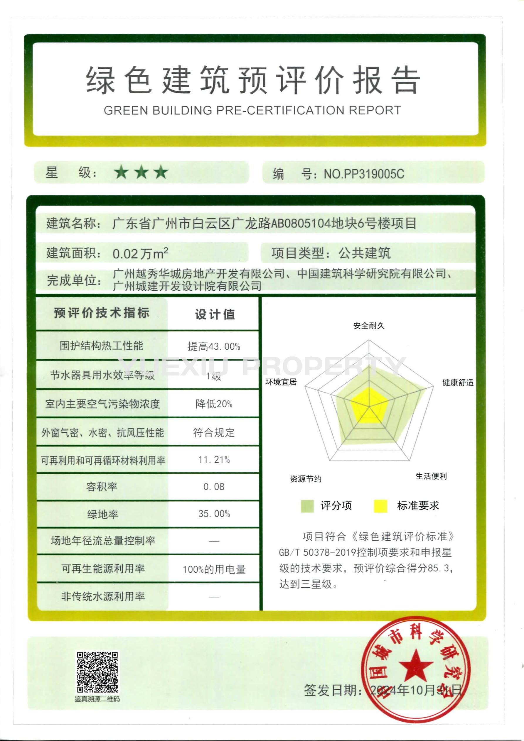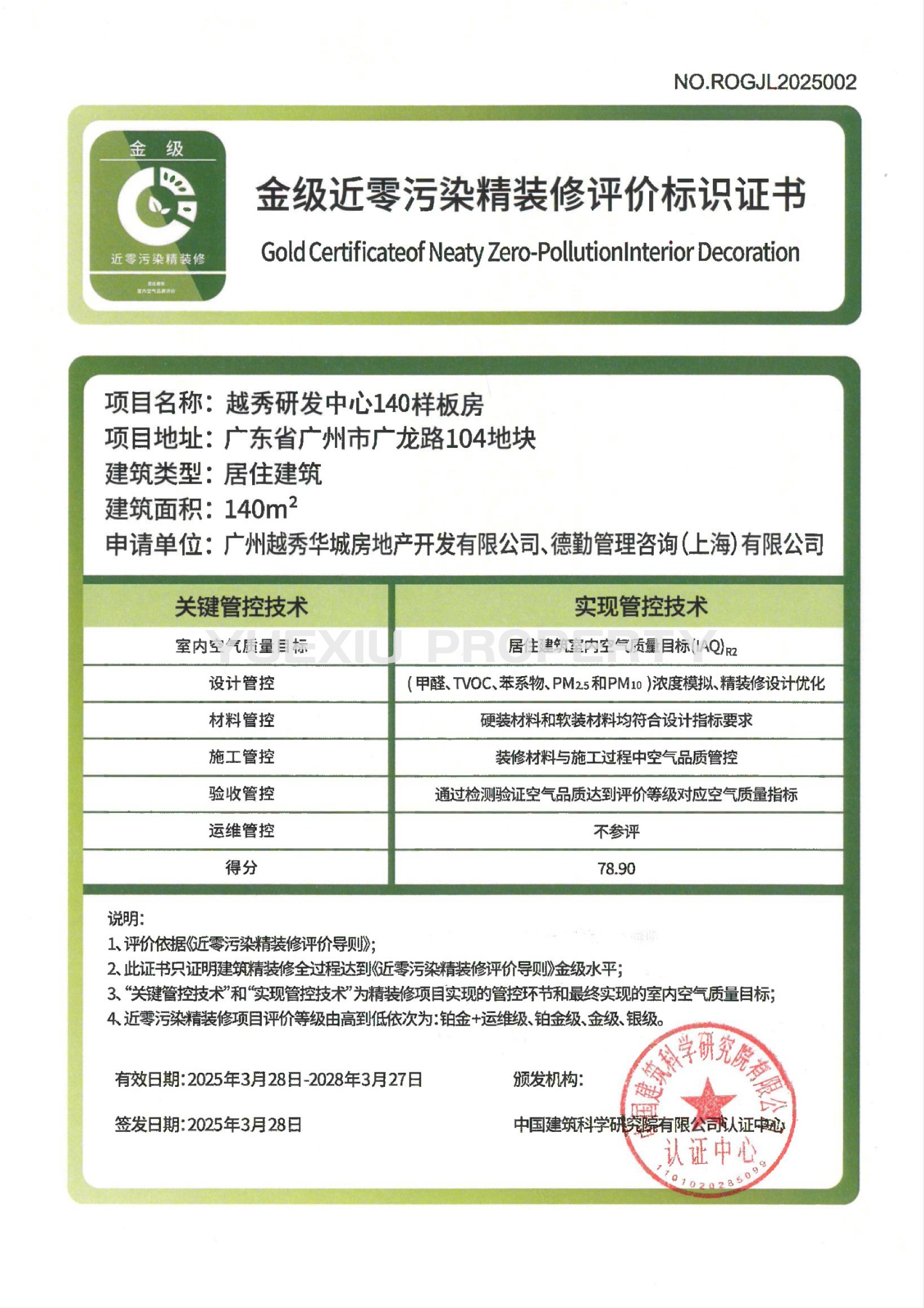 目前建筑本体已获得「零碳建筑认证」、「零能耗建筑认证」、「绿建三星预认证」、「健康建筑金级认证」及「近零污染金级认证」共 5 项认证,是全国第一个近零污染精装修落地的试验项目,是全国第一个集齐零碳建筑、零能耗建筑设计认证、绿色三星级预认证、健康建筑金级认证的建筑项目。
