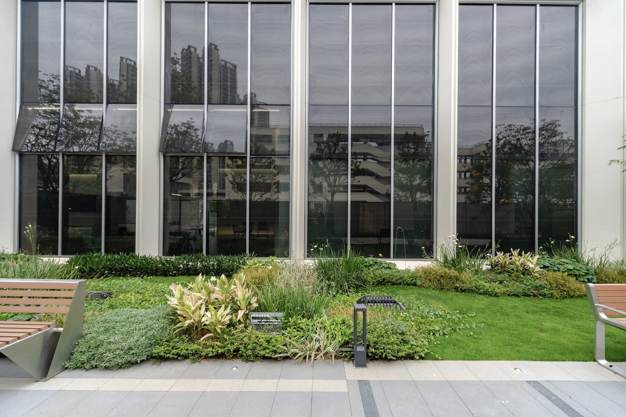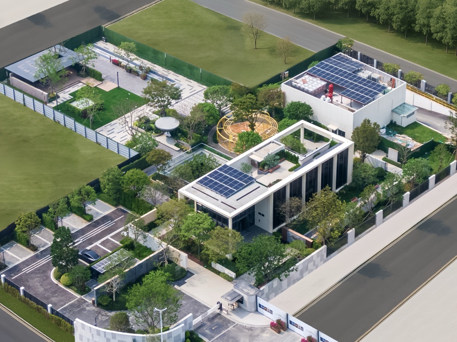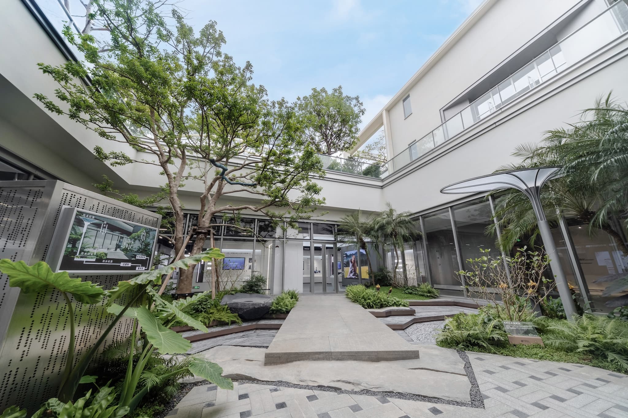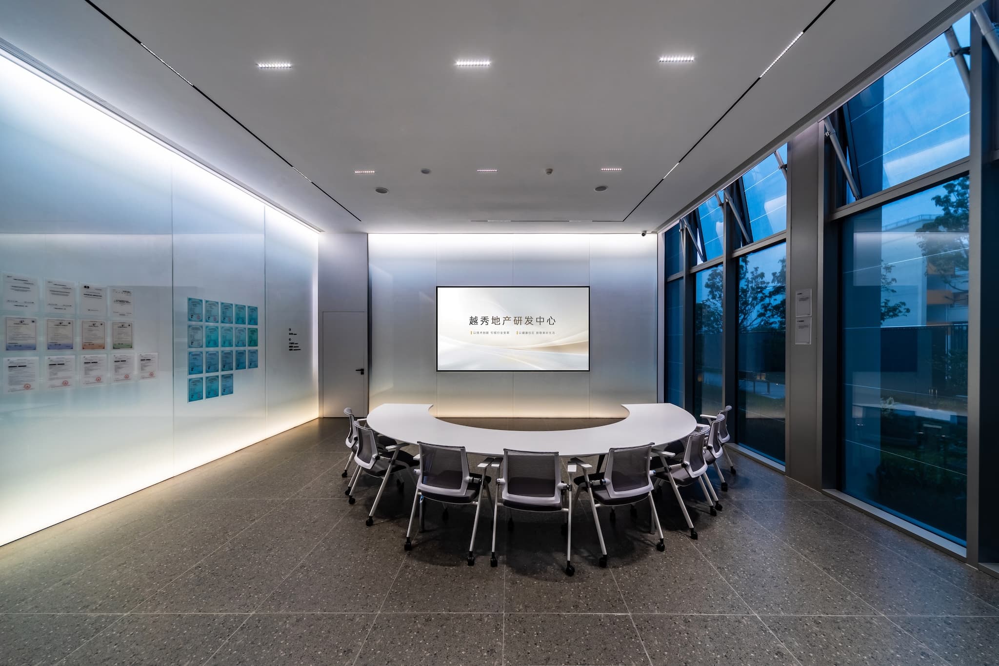 研发中心建筑本身体现了越秀好产品技术沉淀和前沿探索:如地上建筑采用UHPC (Ultra-High Performance Concrete) 高强混凝土预制构件、温变玻璃、光电玻璃、一体化保温围护系统、屋顶光伏系统、光伏直流多联机等技术,实现「建筑碳中和」;地下建筑使用自然通风、自然采光、近零污染、智慧能源控制等技术,打造绿色低碳、健康舒适及智慧便捷的空间。