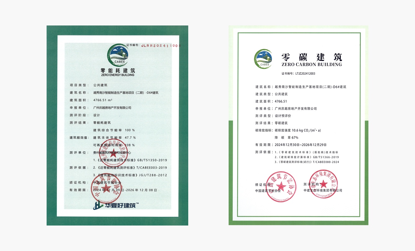 在《近零能耗建筑技术标准》(GB/T51350-2019)的指导下,南沙智能制造生产基地二期作为全国领先获得零碳设计认证和零能耗设计认证的产业园项目,也是越秀地产首个获得“双零”认证的产业园项目。