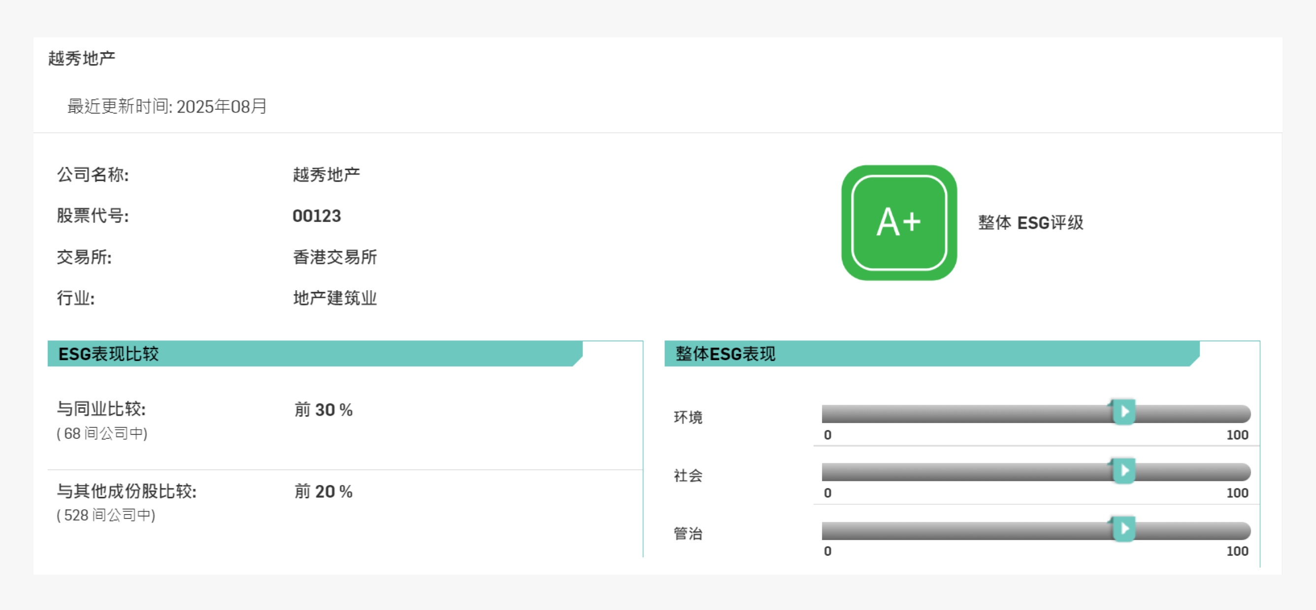 2025年8月28日,香港品质保证局(HKQAA)与香港恒生指数公司发布年度可持续发展评级,越秀地产成功获评“A+”评级,较去年再进一步。这也是公司第三年持续提升该评级,充分反映出公司在可持续发展管理、信息披露与实践绩效方面的不断提升,进一步巩固了行业领先地位。