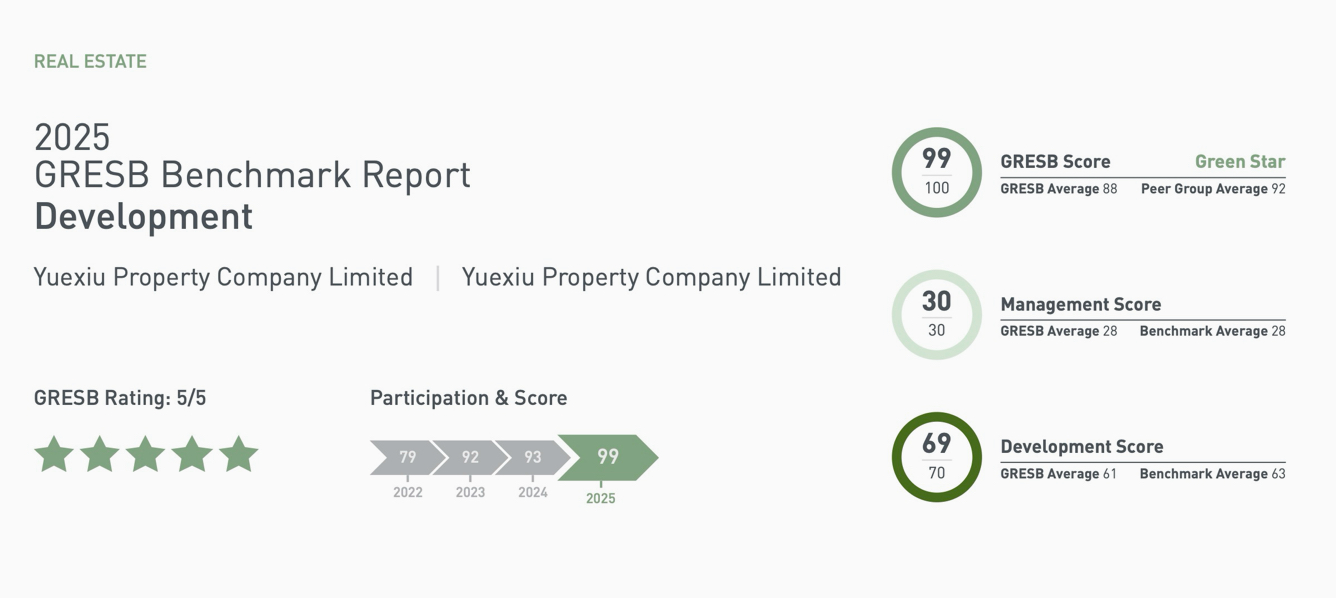 在GRESB最新发布的2025年评级中,越秀地产凭借总体得分99分(满分100分)的卓越成绩,首次荣获“五星级”最高评级,在全球逾2,100家参评房地产企业中排名前20%,位列全球上市房地产企业第7(住宅类、开发赛道)。同时,在GRESB公开披露评级中荣获“A级”最高评级(全球平均为B级),并在“东亚区住宅类”组别中位列第2名。