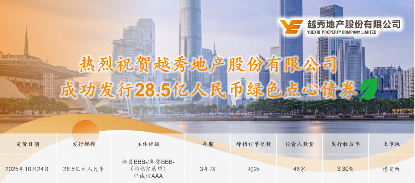 近日,越秀地产成功发行一笔规模为人民币28.50亿元,年期3年的绿色点心债券,票面利率为3.30%;本次发行不仅成为地产行业迄今单笔发行规模最大的绿色点心债券,同时创下近五年来中资房企点心债券的最低发行收益率。